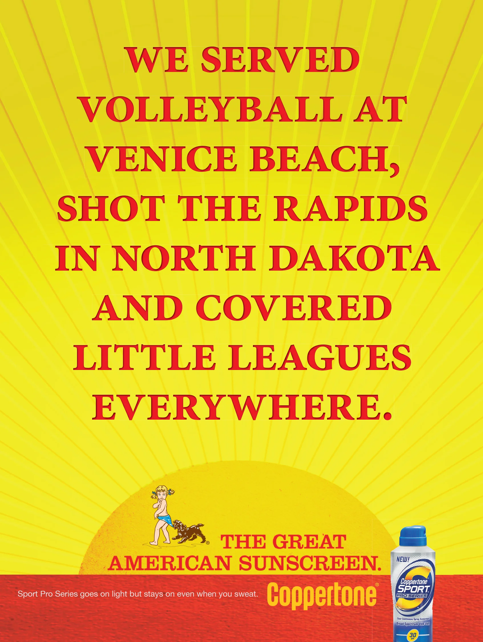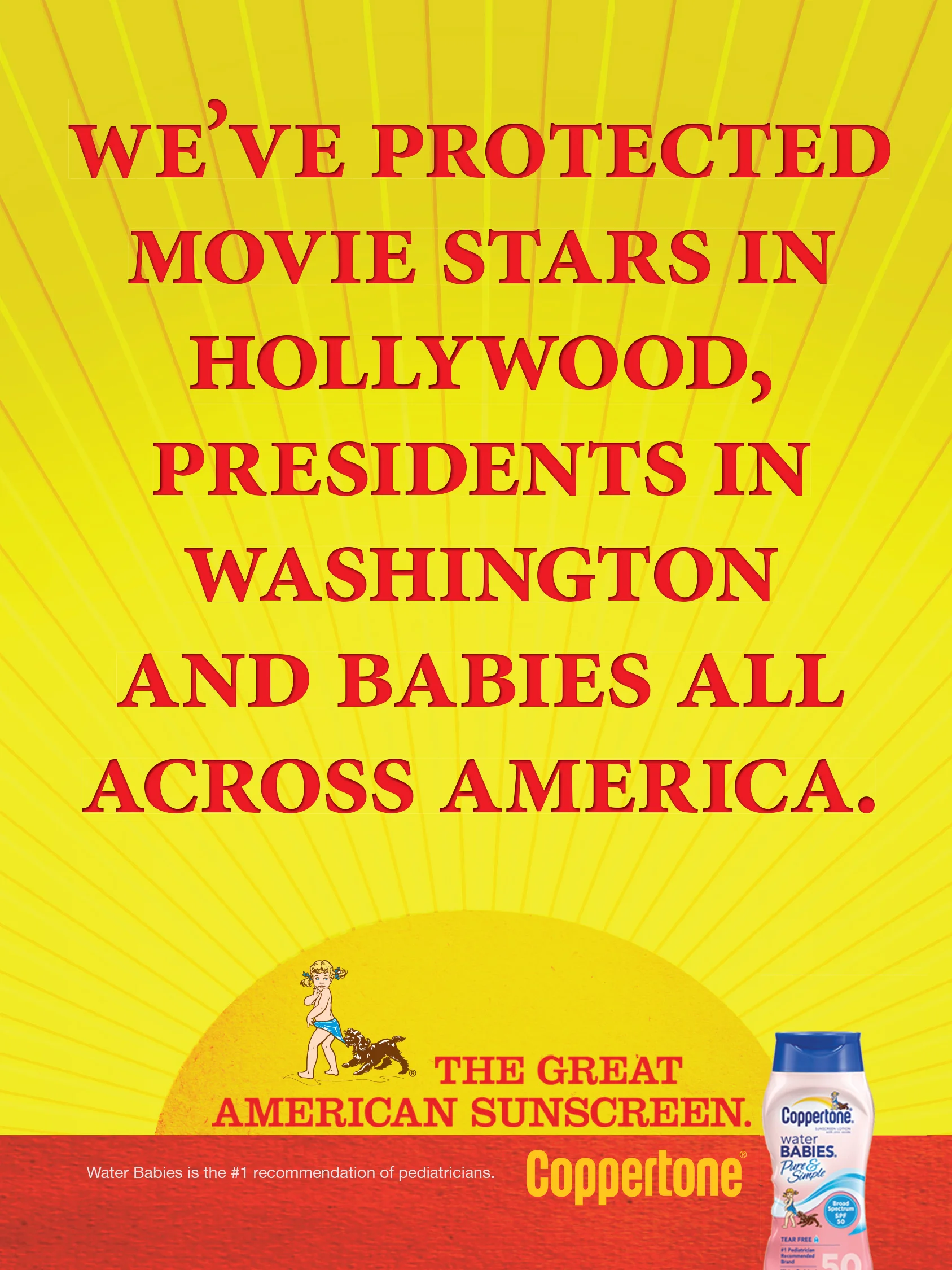 Coppertone is an iconic American brand that’s been around for generations. Everyone has used Coppertone, from movie stars to presidents to babies all across America. Everyone knows it, even just from it’s scent. We created a campaign that encompassed television, on-line, print and outdoor around the fact that no other brand of suntan lotion can make this claim.