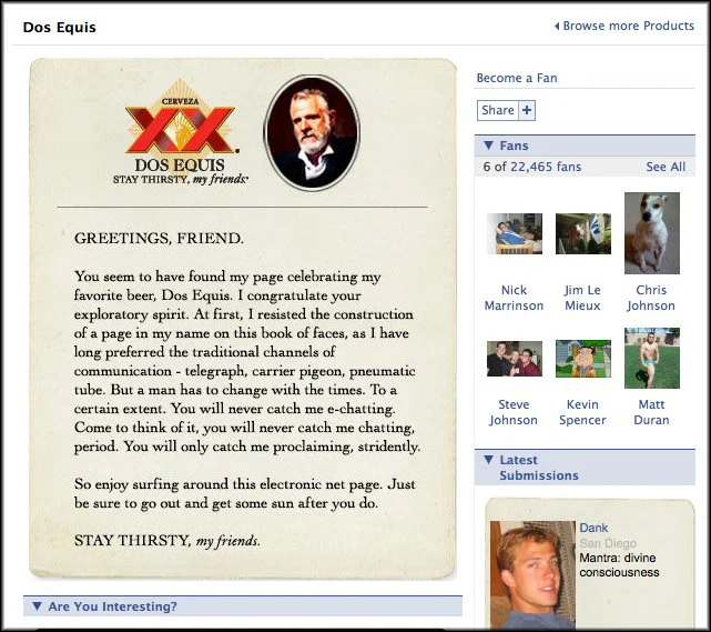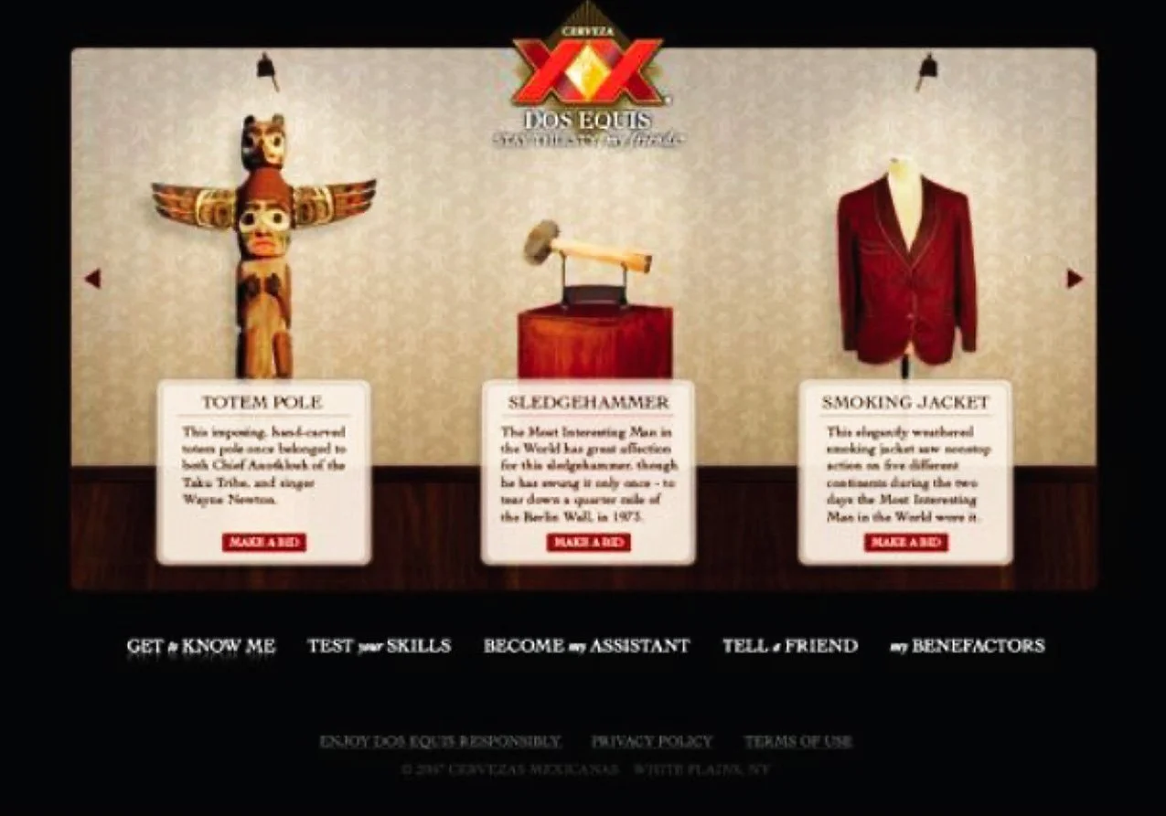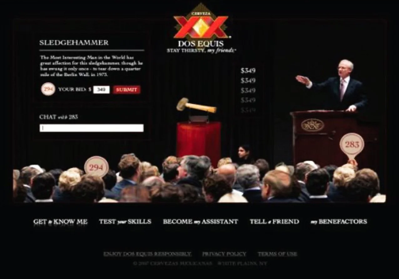 The Dos Equis campaign is about The Most Interesting Man in the World. The website is dedicated to auctioning off his most interesting things. Every week an item from his life, such as the hammer he used to knock down the Berlin Wall, will be auctioned off to the highest bidder.